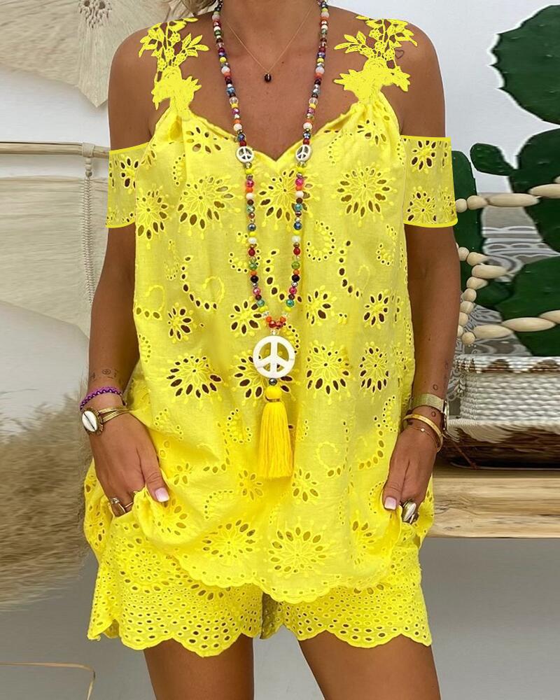 Style:Casual Type:Shorts Set Material:100%Polyester Neckline:Cold Shoulder Sleeve Style:Short Sleeve Length:Above Knee Pattern Type:Plain Decoration:Contrast Lace,Eyelet Embroidery,Pocket Fit Type:Regular Occasion:Daily,Vacation Package Include:1*Shorts Set Fabric Elasticity:Non-Stretch Sheer:No Care Instructions:Machine wash or professional dry clean
