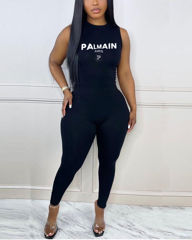 Letter Print Sleeveless Skinny Jumpsuit