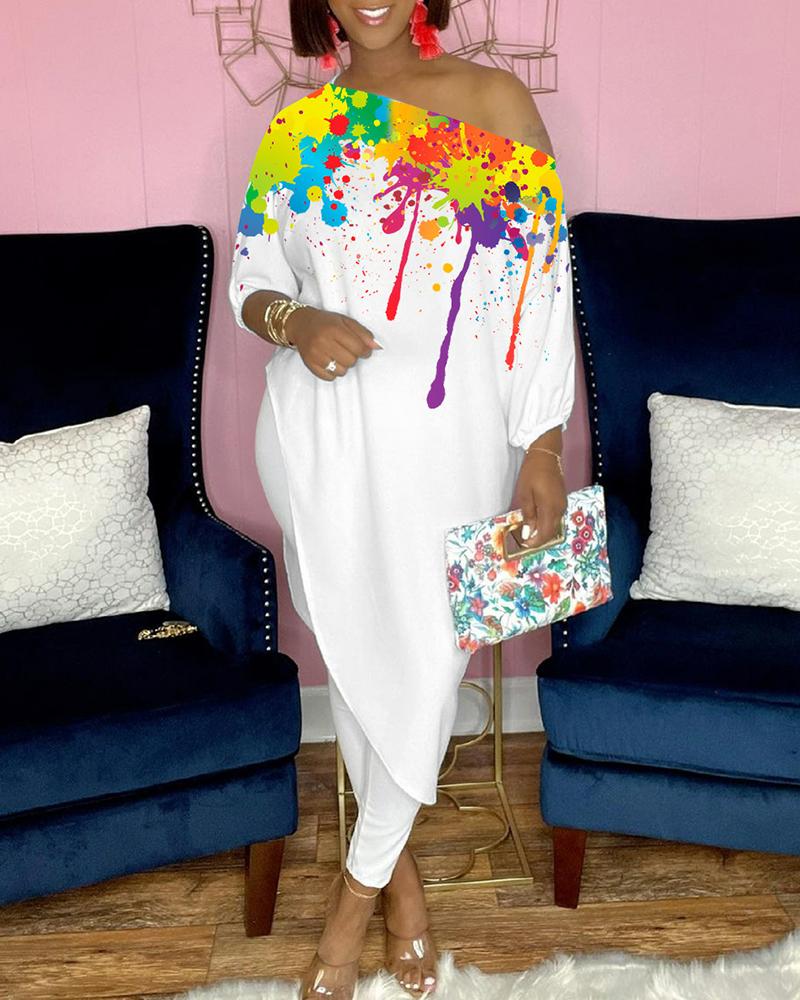 Style:Casual Type:Pants Sets Material:97%Polyester,3%Spandex Neckline:One Shoulder Sleeve Style:Three Quarters Length:Long Pattern Type:Ink Splash Decoration:Asymmetrical Fit Type:Regular Occasion:Daily Package Include:Pants Set