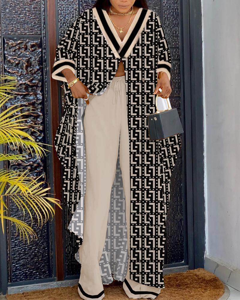 Geometric Print High Slit Longline Top & Pants Set