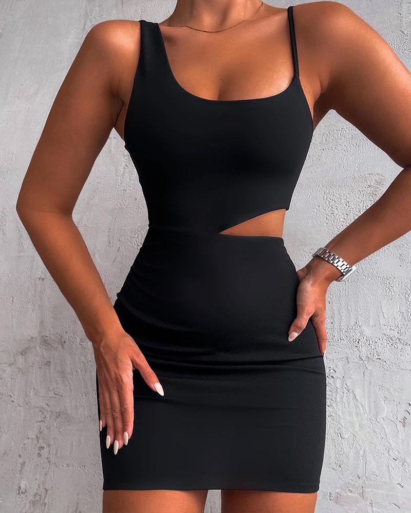 Style:Sexy Type:Bodycon Material:97%Polyester,3%Spandex Neckline:U-Neck Sleeve Style:Sleeveless Length:Mini Pattern Type:Plain Decoration:Cutout Fit Type:Skinny Occasion:Daily Package Include:1* Dress