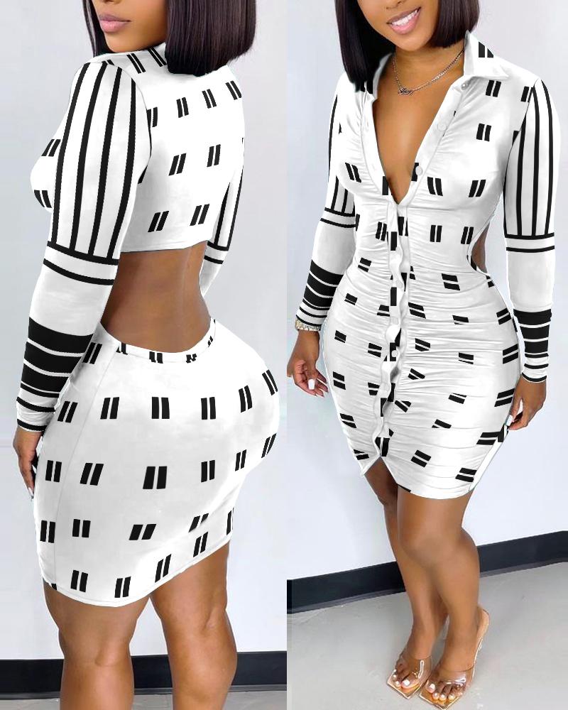Style:Chic,Sexy Type:Bodycon,Shirt Material:97%Polyester,3%Spandex Neckline:Turn-down Collar Sleeve Style:Long Sleeve Length:Mini Pattern Type:Geometric Decoration:Button,Cutout,Ruched Fit Type:Skinny Occasion:Daily Package Include:1* Dress