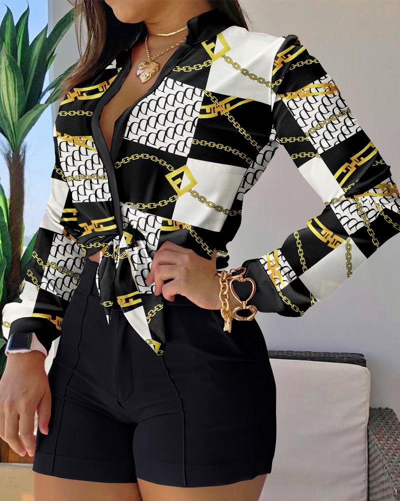 Geometric Chain Print Button Down Shirt & Shorts Set