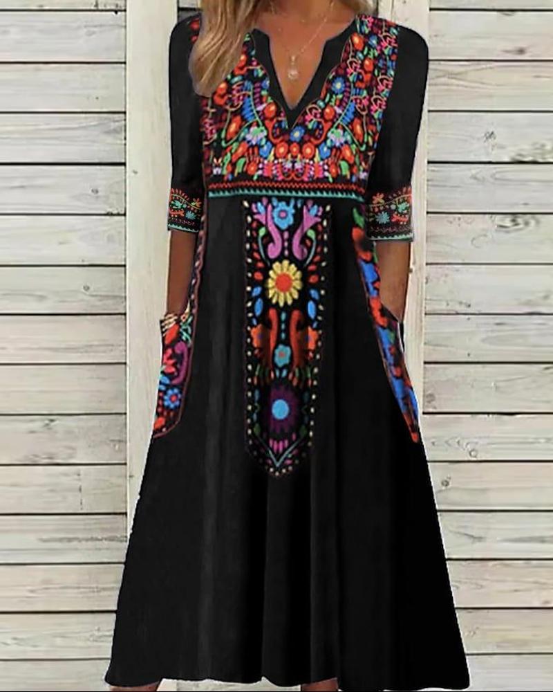Style:Casual,Vintage Type:Straight Material:97%Polyester,3%Spandex Neckline:V-Cut Sleeve Style:Half Sleeve Length:Mid-Calf Pattern Type:Tribal Decoration:Pocket Fit Type:Regular Occasion:Daily Package Include:1* Dress