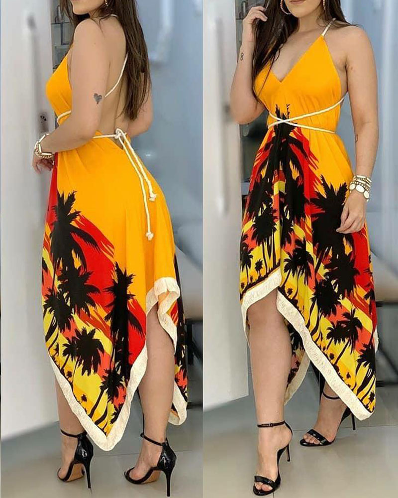 Style:Casual,Chic Type:A Line,Asymmetrical,Cami Material:100%Polyester Neckline:Halter Sleeve Style:Sleeveless Length:Asymmetrical Pattern Type:Tropical Decoration:Backless,Criss Cross,Tied Detail Fit Type:Regular Occasion:Daily,Vacation Package Include:1* Dress Fabric Elasticity:Slight Stretch