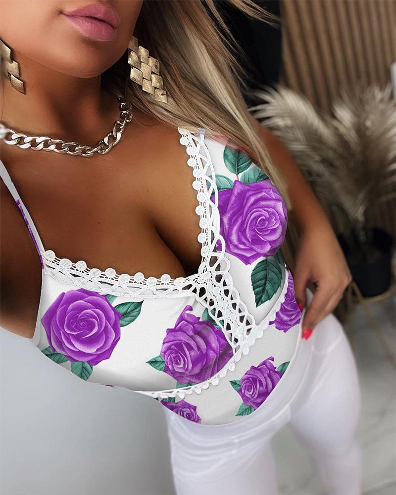 Floral Print Guipure Lace Patch Cami Top