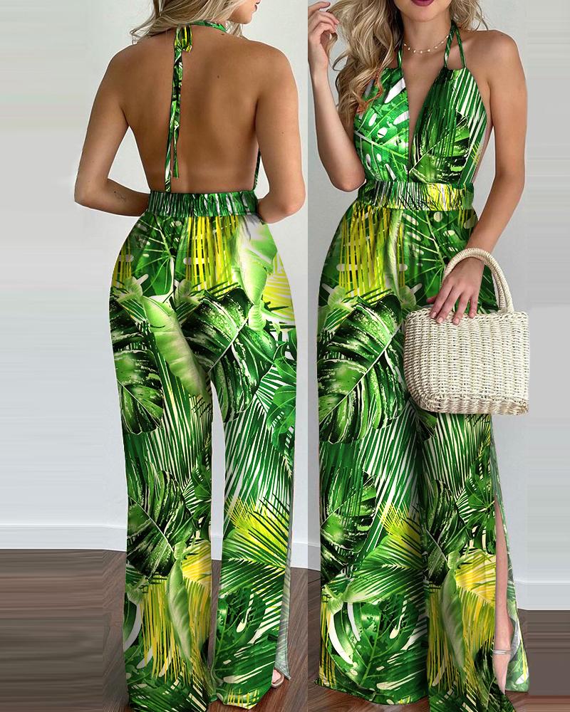 Tropical Print Split Hem Halter Backless Jumpsuit