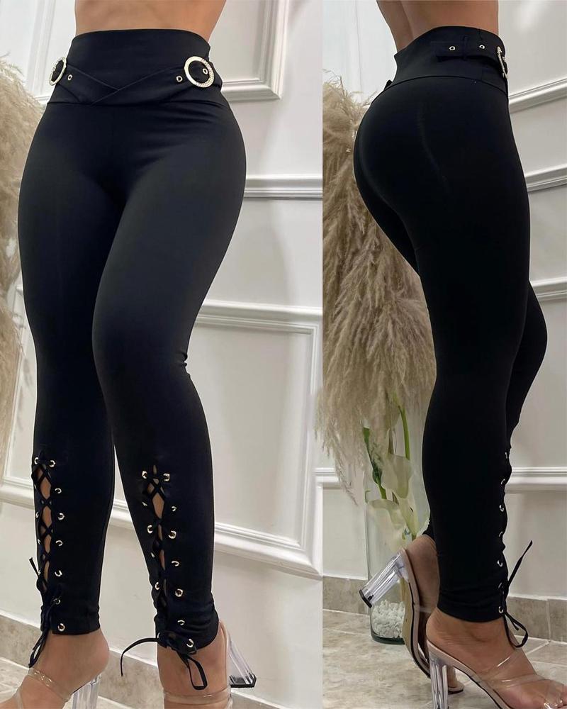 Style:Casual Type:High Waist Material:97%Polyester,3%Spandex Length:Long Pattern Type:Plain Decoration:Eyelet,Lace-up Fit Type:Skinny Occasion:Daily Package Include:1*Pants