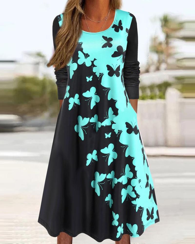 Style:Casual,Chic Type:A Line Material:97%Polyester,3%Spandex Neckline:Scoop Neck Sleeve Style:Long Sleeve Length:Mini Pattern Type:Butterfly,Colorblock Fit Type:Regular Occasion:Daily Package Include:1* Dress