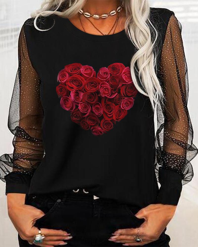 Valentine's Day Floral Heart Print Contrast Mesh Long Sleeve Top