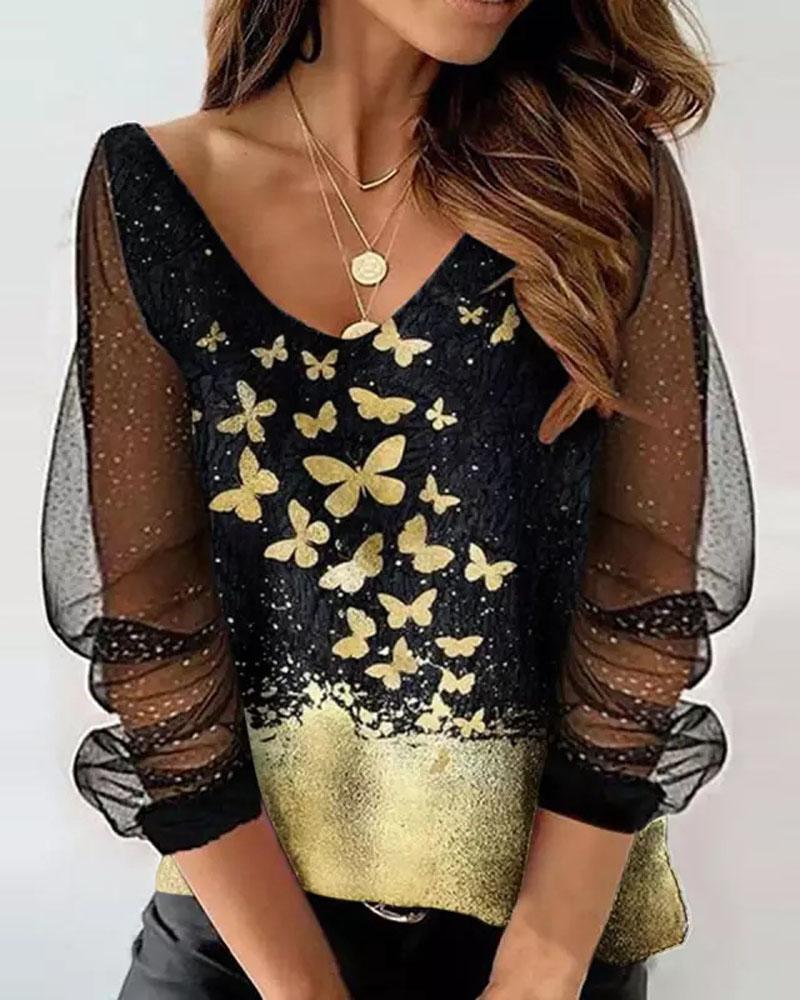 Butterfly Print Contrast Mesh Long Sleeve Top