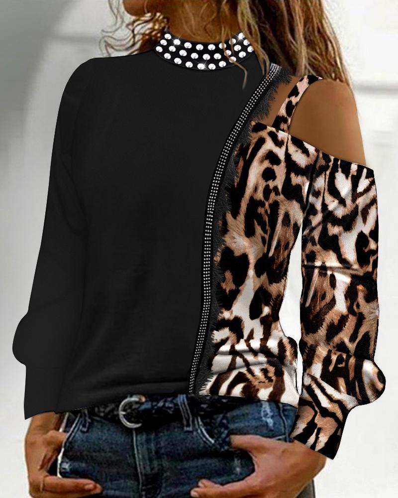 Leopard Print Rhinestone Decor Cold Shoulder Top