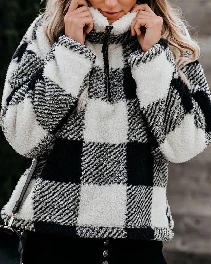 Plaid Print Zip Detail Long Sleeve Fluffy Sweatshirt