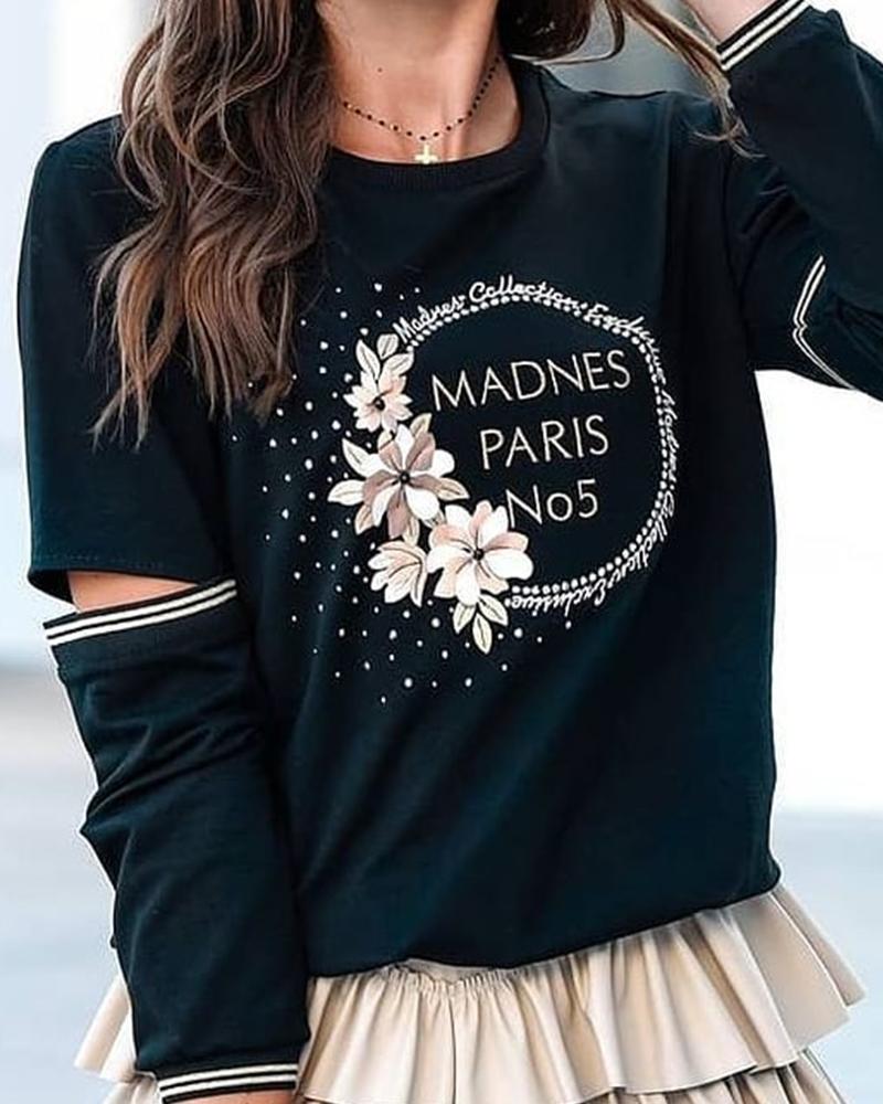 Floral Letter Print Long Sleeve Cutout Top