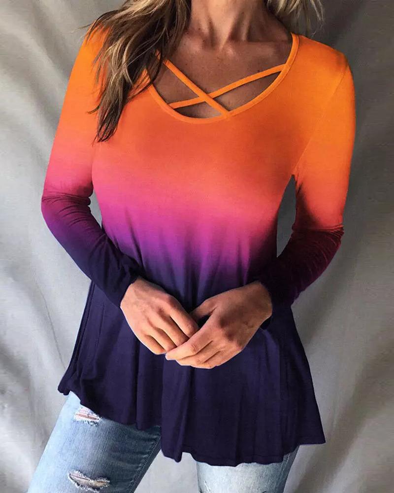 Style:Casual Type:Tee Material:97%Polyester,3%Spandex Neckline:V-Neck Sleeve Style:Long Sleeve Length:Regular Pattern Type:Tie Dye,Ombre Decoration:Criss Cross Fit Type:Regular Occasion:Daily Package Include:1*Top
