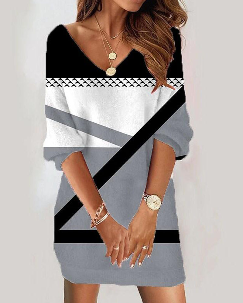 Style:Casual Type:Straight Material:97%Polyester,3%Spandex Neckline:V-Neck Sleeve Style:Long Sleeve Length:Mini Pattern Type:Geometric Fit Type:Regular Occasion:Daily Package Include:1* Dress