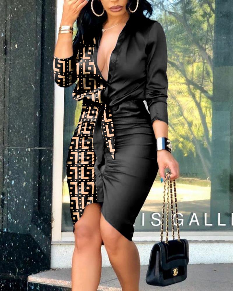 Style:Casual Type:Shirt Material:100%Polyester Neckline:Turn-down Collar Sleeve Style:Long Sleeve Length:Midi Pattern Type:Geometric Decoration:Button,Ruched,Tied Detail Fit Type:Skinny Occasion:Daily Package Include:1* Dress