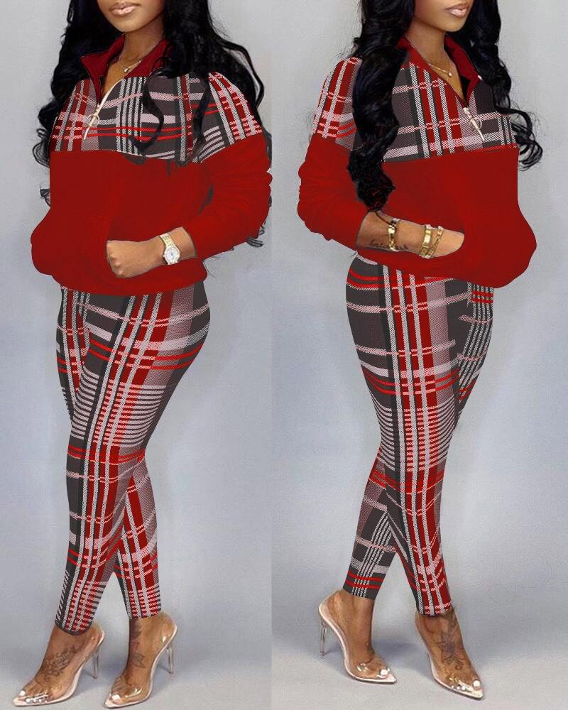 Plaid Print Colorblock Zip Front Top & Pants Set