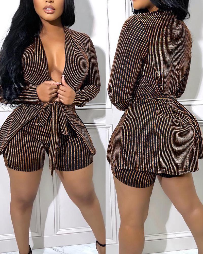 Style:Casual Type:Shorts Set Material:97%Polyester,3%Spandex Neckline:Open Front Sleeve Style:Long Sleeve Length:Above Knee Pattern Type:Striped Fit Type:Regular With Belt:Yes Occasion:Daily Package Include:1*Shorts Set (With Belt)