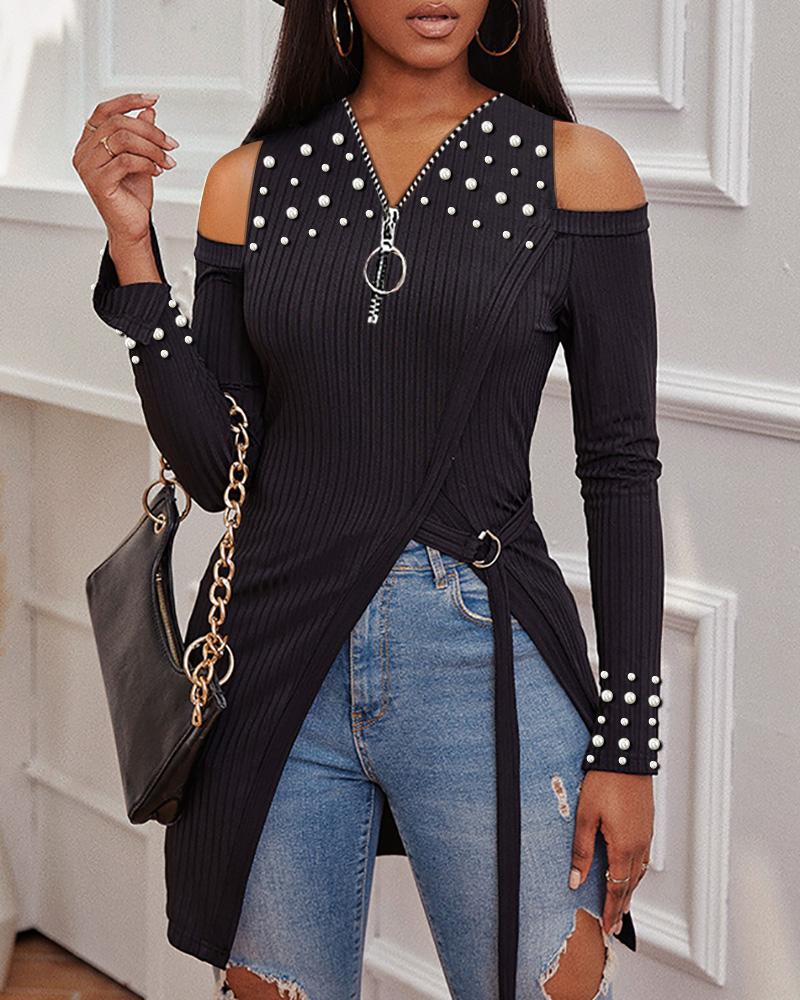 Cold Shoulder Pearls Decor Zip Front High Slit Top