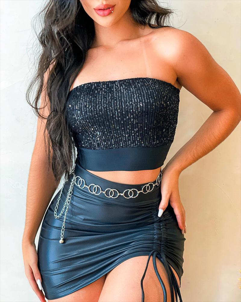 Contrast Sequin Crop Tube Top & Drawstring Ruched Skirt Set