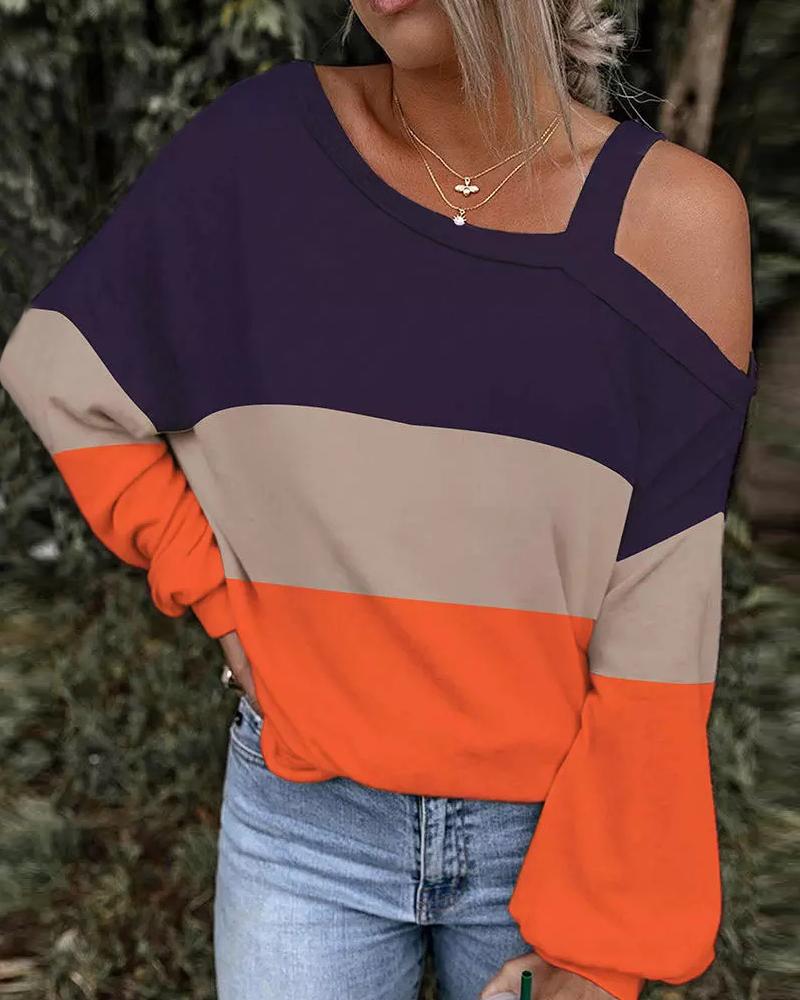 Style:Casual Type:Tee Material:97%Polyester,3%Spandex Neckline:Cold Shoulder Sleeve Style:Long Sleeve Length:Regular Pattern Type:Colorblock Fit Type:Regular Occasion:Daily Package Include:1*Top