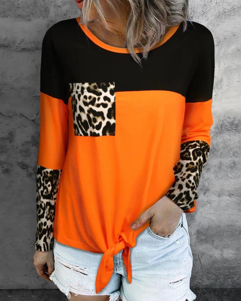 Style:Casual Type:Tee Material:97%Polyester,3%Spandex Neckline:Round Neck Sleeve Style:Long Sleeve Length:Regular Pattern Type:Colorblock,Leopard Decoration:Pocket,Tied Detail Fit Type:Regular Occasion:Daily Package Include:1*Top