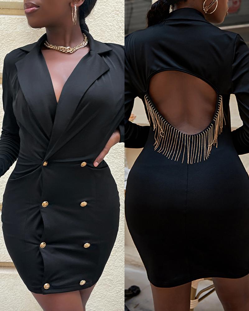 Style:Chic Type:Bodycon Material:97%Polyester,3%Spandex Neckline:Notched Collar Sleeve Style:Long Sleeve Length:Mini Pattern Type:Plain Decoration:Backless,Button,Tassel Fit Type:Skinny Occasion:Daily,Night Out Package Include:1* Dress