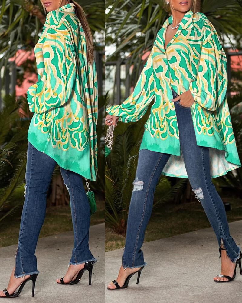 Abstract Print Lantern Sleeve Dip Hem Button Down Shirt