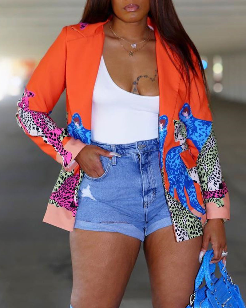 Leopard Print Lapel Collar Long Sleeve Blazer