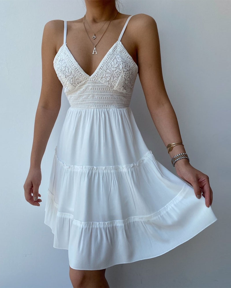 Style:Chic,Sexy Type:A Line Material:100%Polyester Neckline:V-Neck Sleeve Style:Spaghetti Strap Length:Mini Pattern Type:Plain Decoration:Backless,Contrast Lace,Tied Detail,Cutout,Frill Hem,Ruffles Fit Type:Regular Occasion:Daily Package Include:1* Dress