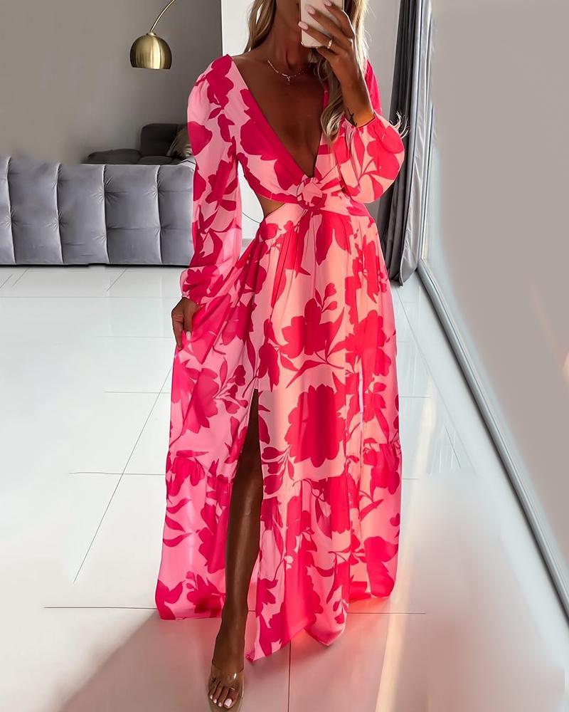 Plunge Lantern Sleeve High Slit Cutout Floral Print Maxi Dress