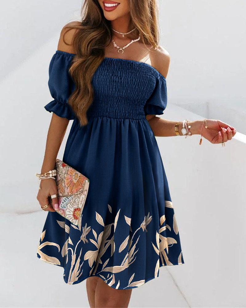 Plants Print Off Shoulder Shirred Swing Dress