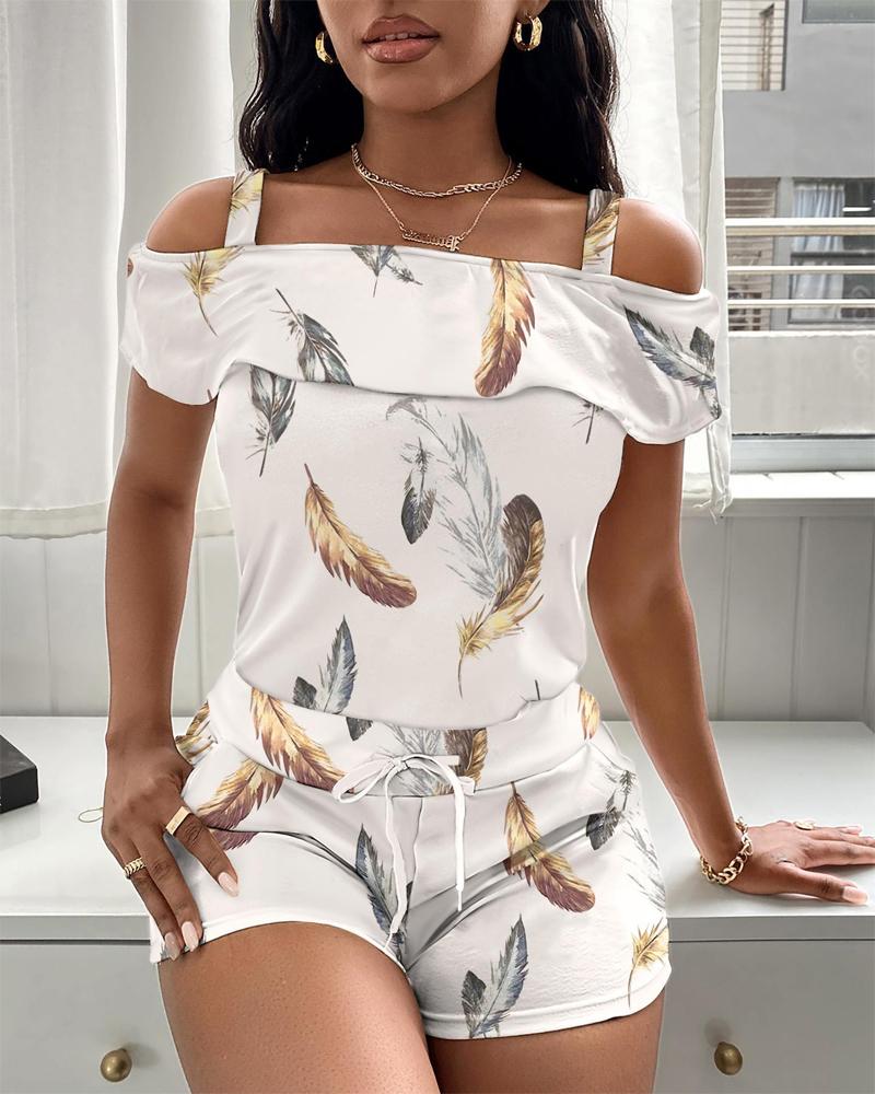Style:Casual Type:Shorts Set Material:97%Polyester,3%Spandex Neckline:Cold Shoulder Sleeve Style:Short Sleeve Length:Above Knee Pattern Type:Graphic Decoration:Drawstring,Pocket,Ruffles Fit Type:Regular Occasion:Daily Package Include:1*Shorts Set