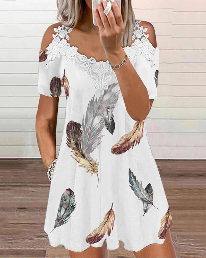Feather Print Contrast Lace Cold Shoulder Swing Dress