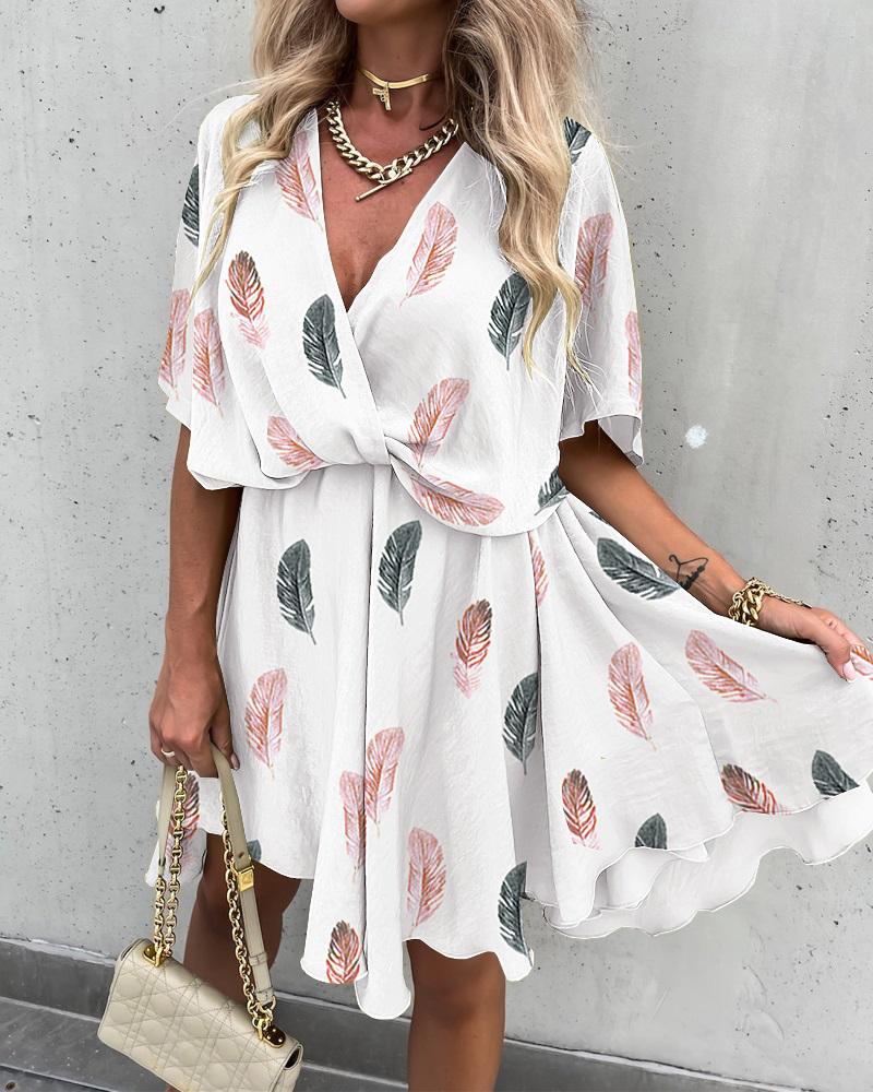 Feather Print V-Neck Short Sleeve Dress