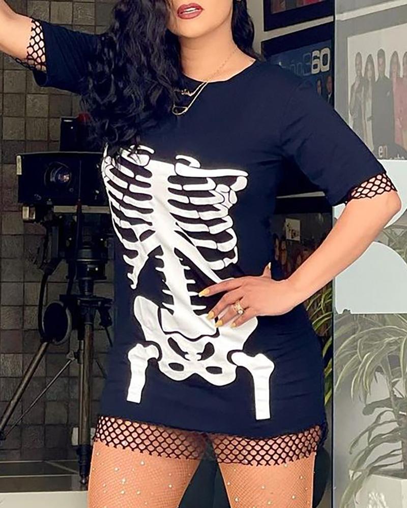 Halloween Fishnet Patch Skeleton Print T-Shirt Dress
