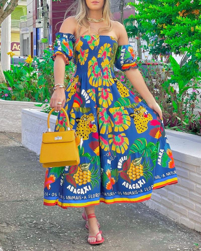 Style:Casual,Chic Type:Flared Material:100%Polyester Neckline:Off the Shoulder Sleeve Style:Short Sleeve Length:Mid-Calf Pattern Type:Cartoon,Fruit & Vegetable,Graphic,Letter,Plants Decoration:Shirred Fit Type:Regular Occasion:Daily,Vacation Package Include:1* Dress