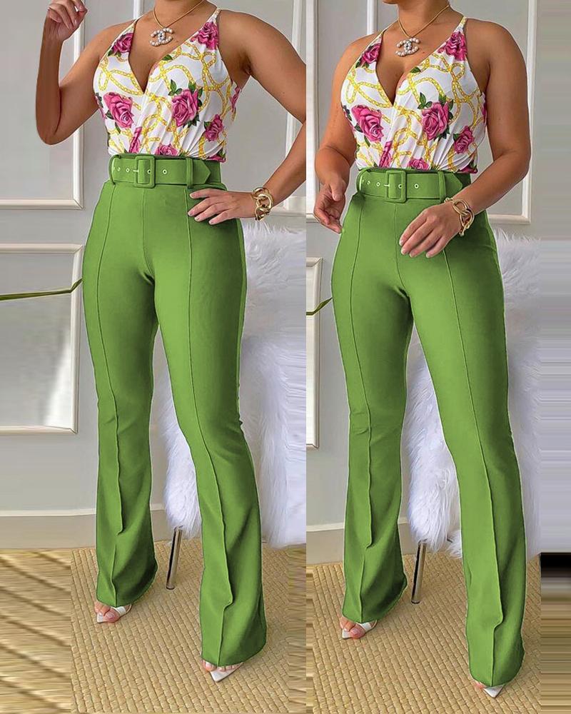 Style:Chic,Sexy Type:Pants Sets Material:97%Polyester,3%Spandex Neckline:V-Neck Sleeve Style:Spaghetti Strap Length:Long Pattern Type:Chain,Floral,Plain Decoration:Criss Cross Fit Type:Skinny With Belt:Yes Occasion:Daily Package Include:1*Pants Set (With Belt)