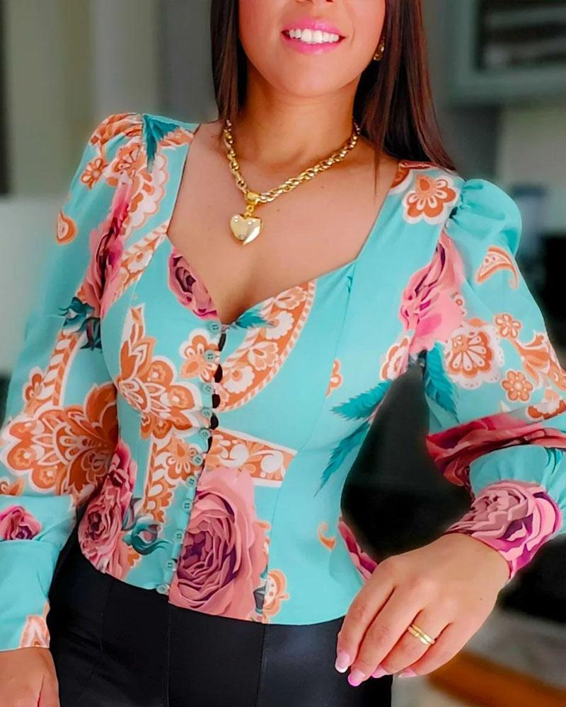 Style:Chic Type:Blouses Material:100%Polyester Neckline:Sweetheart Neck Sleeve Style:Long Sleeve,Puff Sleeve Length:Regular Pattern Type:Floral Decoration:Button,Puff Sleeve Fit Type:Regular Occasion:Daily Package Include:1* Blouse Fabric Elasticity:Slight Stretch