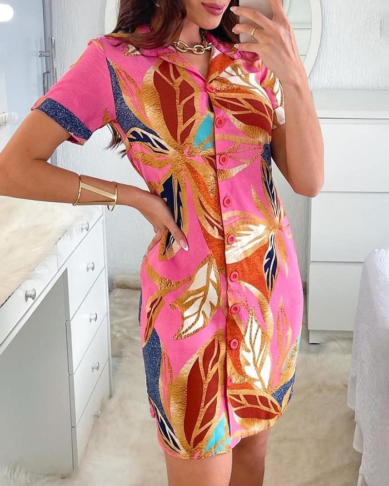 Style:Chic Type:Straight Material:100%Polyester Neckline:Turn-down Collar Sleeve Style:Short Sleeve Length:Mini Pattern Type:Plants Decoration:Button Fit Type:Regular Occasion:Daily Package Include:1* Dress