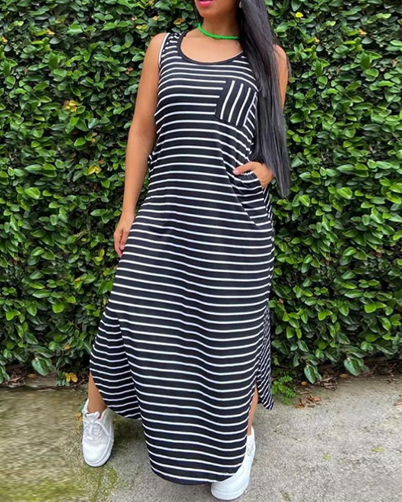Style:Basics,Casual Type:Tank Material:97%Polyester,3%Spandex Neckline:Scoop Neck Sleeve Style:Sleeveless Length:Maxi Pattern Type:Striped Decoration:Pocket Fit Type:Oversized Occasion:Daily,Vacation Package Include:1* Dress
