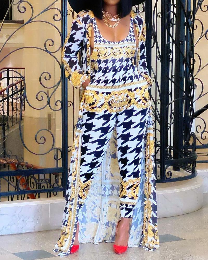 Houndstooth Print Tank Top & Pants Set With Longline Coat