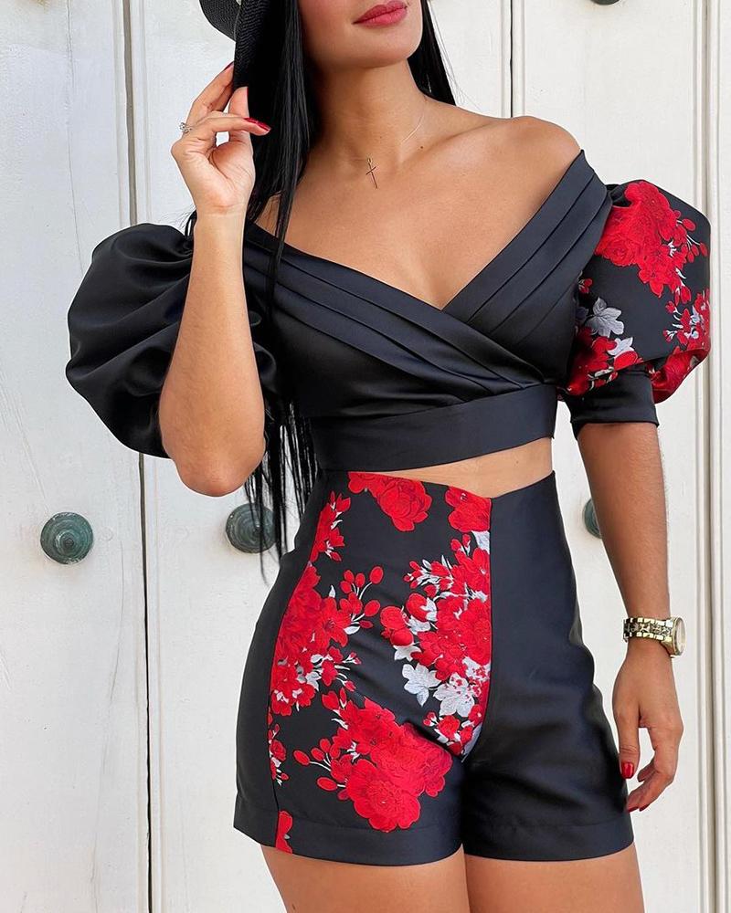 Floral Print Lantern Sleeve Top & Shorts Set