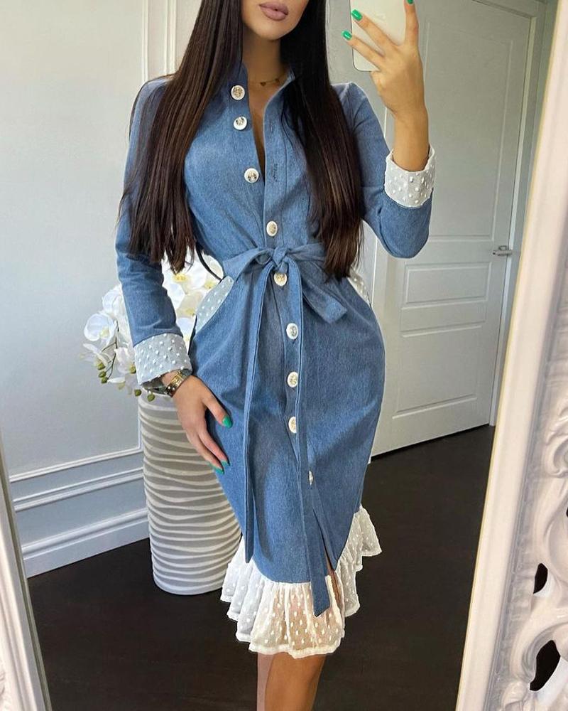 Swiss Dot Mesh Patch Button Design Shirt Dress
