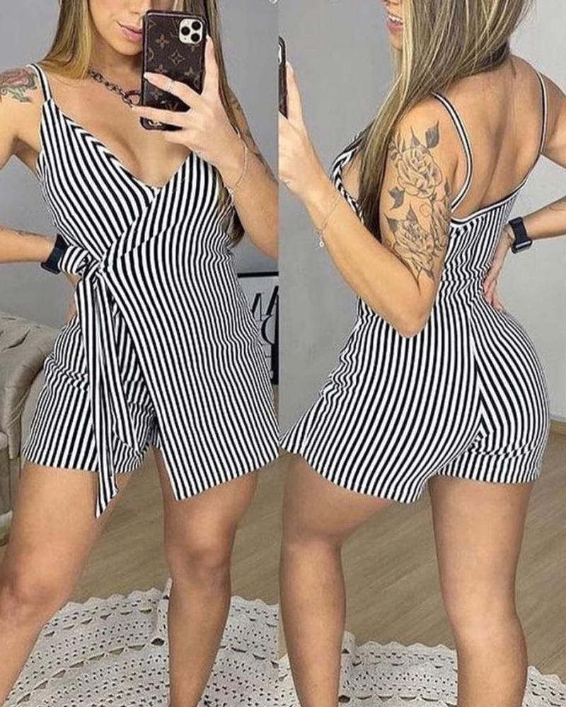 Style:Casual,Chic Type:Romper Material:100%Polyester Neckline:V-Neck Sleeve Style:Spaghetti Strap Length:Above Knee Pattern Type:Striped Decoration:Tied Detail Fit Type:Regular Occasion:Daily Package Include:1*Romper