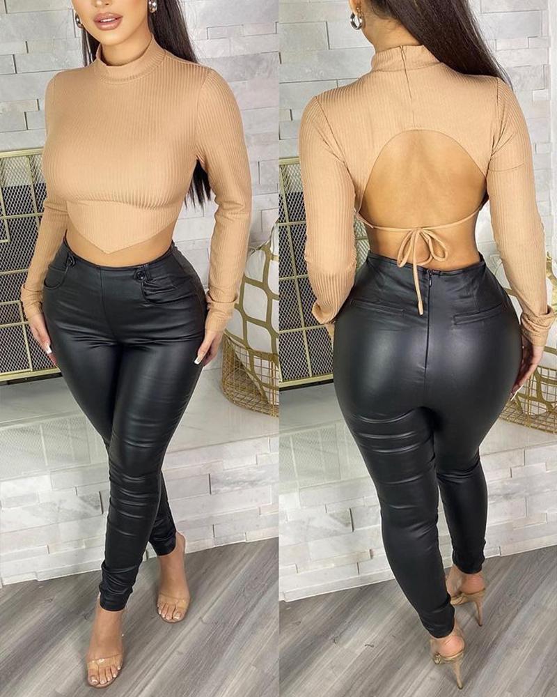 Style:Chic,Sexy Type:Ribbed Top Material:97%Polyester,3%Spandex Neckline:Mock Neck Sleeve Style:Long Sleeve Length:Crop Pattern Type:Plain Decoration:Backless,Tied Detail,Zipper Fit Type:Skinny Occasion:Daily Package Include:1*Top