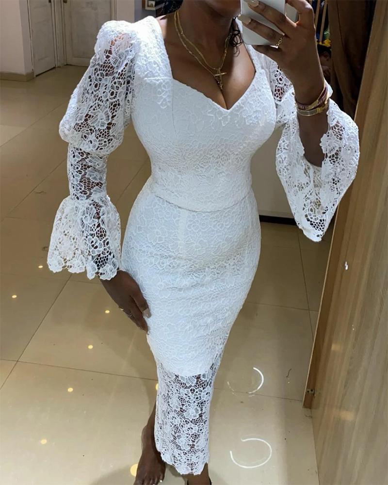 Style:Chic,Elegant Type:Bodycon Material:97%Polyester,3%Spandex Neckline:Sweetheart Neck Sleeve Style:Long Sleeve,Bell Sleeve,Puff Sleeve Length:Midi Pattern Type:Plain Decoration:Puff Sleeve,Bell Sleeve Fit Type:Skinny Occasion:Party,Evening Package Include:1* Dress