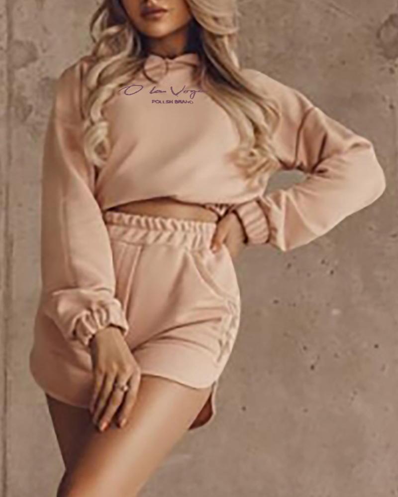 Style:Casual Type:Shorts Set Material:97%Polyester,3%Spandex Neckline:Hooded Sleeve Style:Long Sleeve,Lantern Sleeve Length:Above Knee Pattern Type:Letter Decoration:Lantern Sleeve,Pocket Fit Type:Regular Occasion:Daily Package Include:Shorts Set