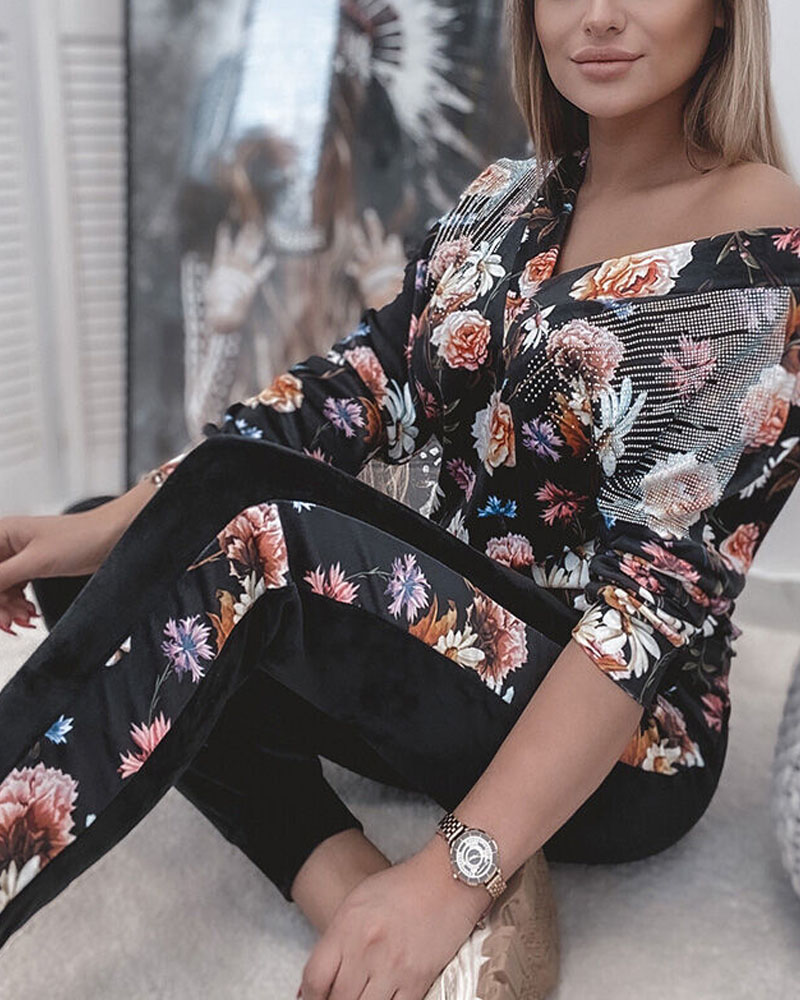 Floral Print Long Sleeve Top & Drawstring Pants Set